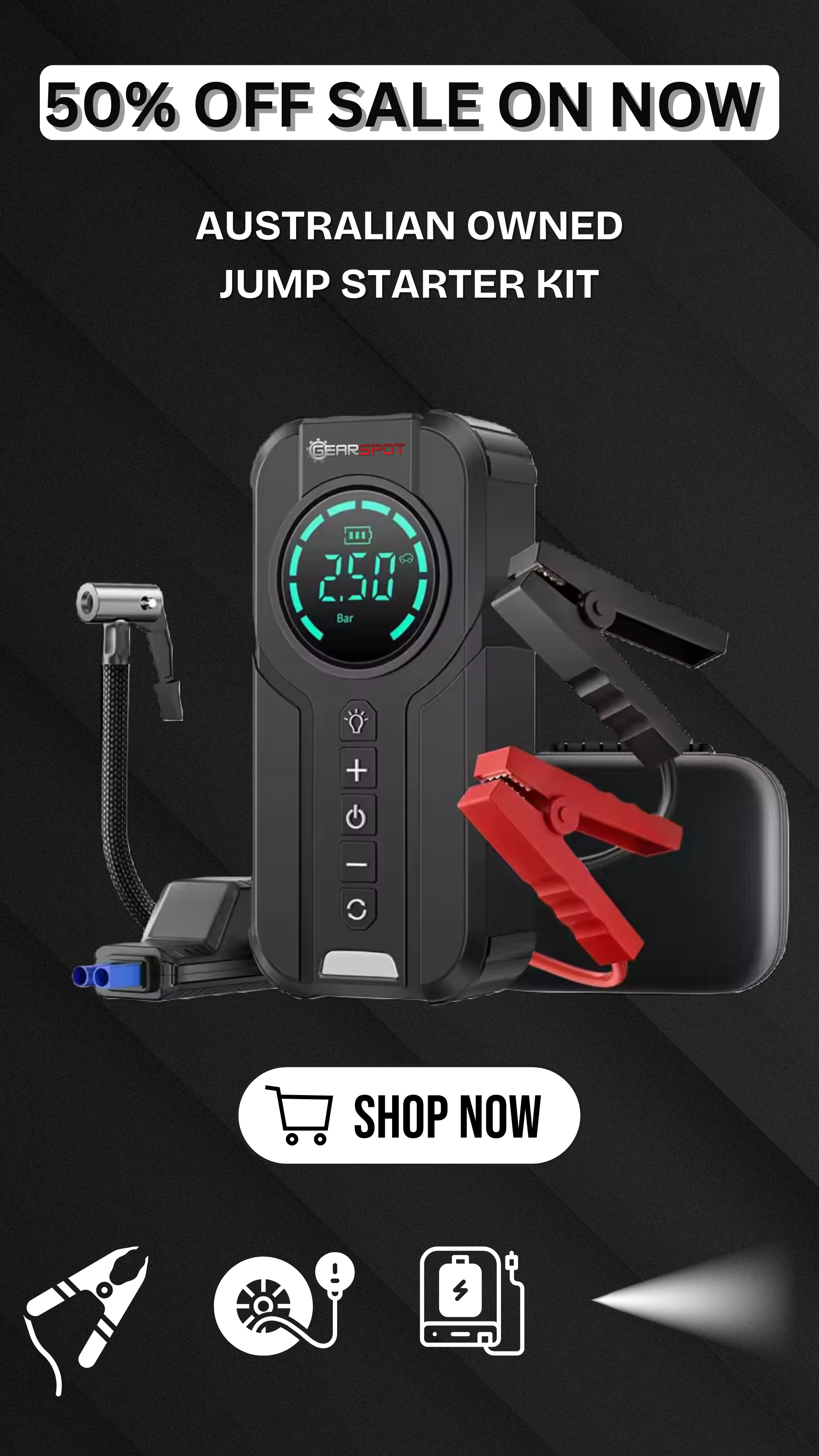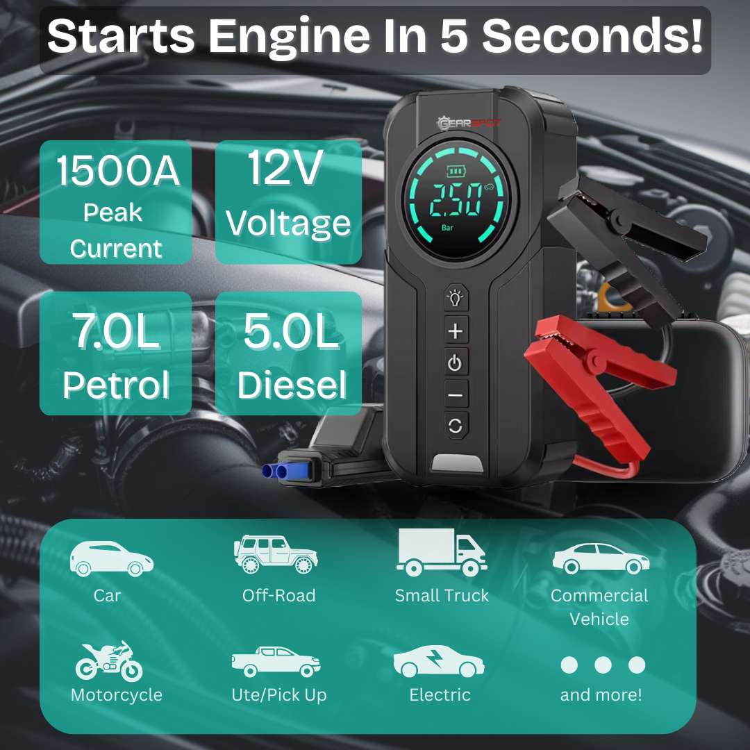 4-in-1 Heavy-Duty Multi-Tool: Jump starter, air pump, power bank, and LED torch built into one tough, no-nonsense unit.